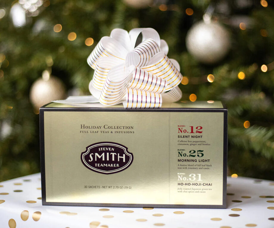 A delicious combination of Smith‘s three most spirited holiday teas to introduce you to their joyful flavors. An excellent gift and delicious counter decor for the holidays and beyond. Assortment features 30 biodegradable sachets with 10 of each holiday flavor including Morning Light black tea, Ho-Ho-Hoji-Chai roasted green tea and Silent Night herbal infusion. Here’s to the present moment. And the after-the-presents moment.