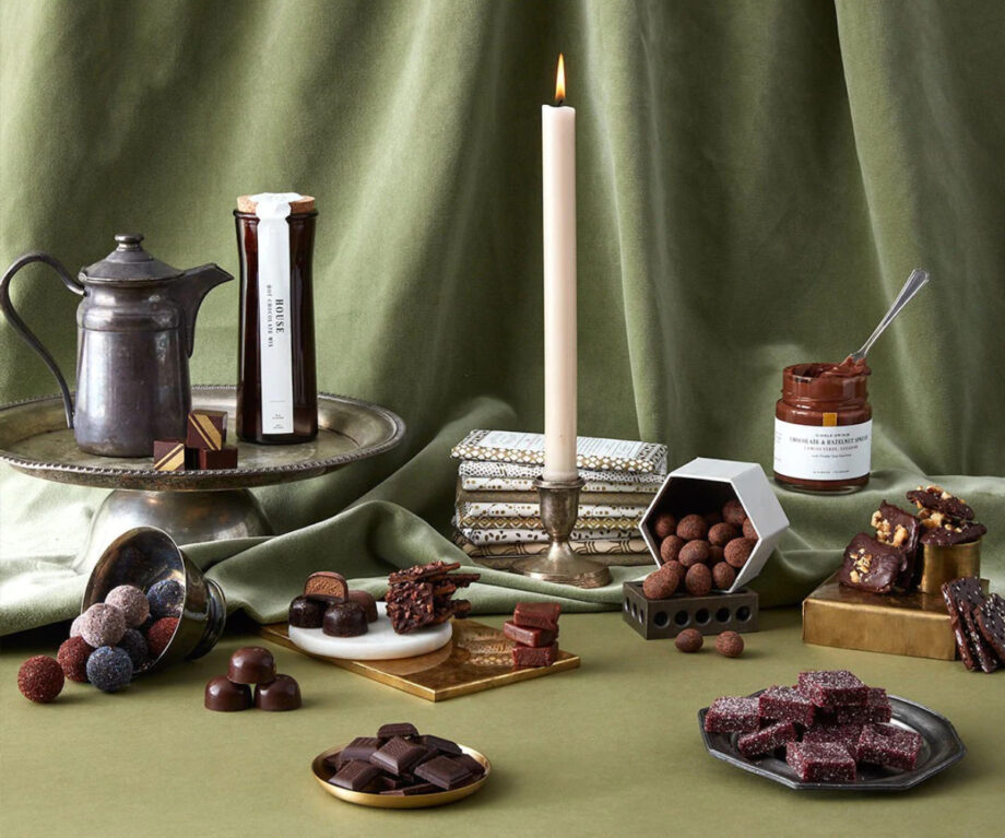 In this bountiful collection, you’ll experience all three Curated Sets, presented together in a red-beribboned gift tower. You’ll savor thirteen distinctive single-origin chocolate bars, a flight of flavorful hot chocolate mixes, seven locally crafted collaborator favorites (from crunchy chocolate-covered nuts and buttery toffees to silky Sea Salt Caramels), and an exclusive assortment of house-made confections.