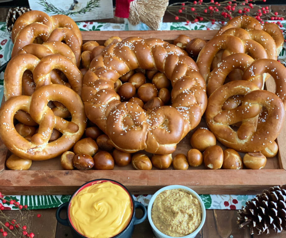 There is something for every soft pretzel lover in this holiday gift pack! Included are all of Milwaukee Pretzel Company‘s favorite pretzels and dips! Plus, each wreath is made of three braided pretzel strands and complete with a pretzel bow for a festive touch. Pretzels and dips will serve 10+ people.