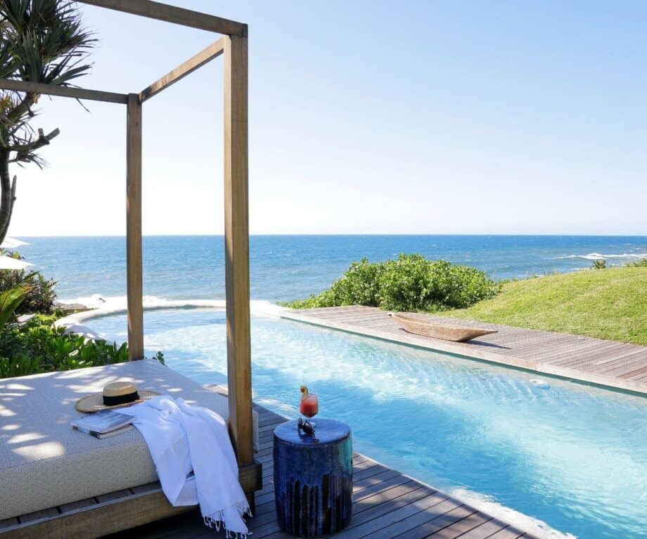 Sala Beach House on South Africa’s Dolphin Coast boasts a fabulous infinity pool perched on the edge of the cliff, with panoramic views of the Indian Ocean—and is an ideal spot for watching dolphins and whales playing in the surf as well as enjoying the sunrise.