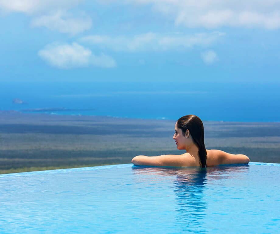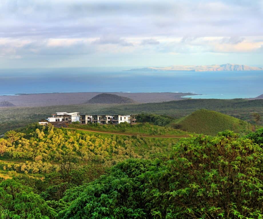 From the lodge, visitors will enjoy expansive views of the pristine, arid savannah of the adjacent Galapagos National Park by looking north to extinct volcanic cones shrouded in mist, as well as mountains covered with lush tropical cloud forests, and green pasture farms by looking to the south-west; along with a 270-degree view of the seemingly infinite Pacific Ocean with nearby islands as a backdrop.