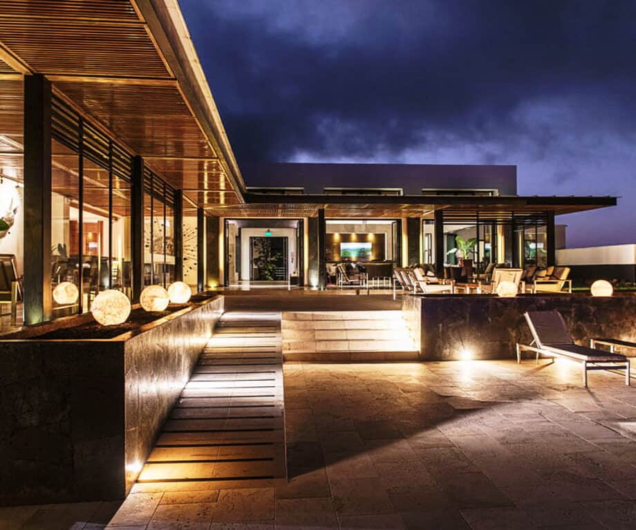 The lodge has adopted a contemporary architectural design that expresses horizontal lines through steel and glass softened by pale wood and volcanic stone as its building materials. The separation between interior spaces and outdoor areas is achieved by the lodge’s floor-to-ceiling windows, which create an uninterrupted view of the Galapagos highlands and Pacific Ocean.
