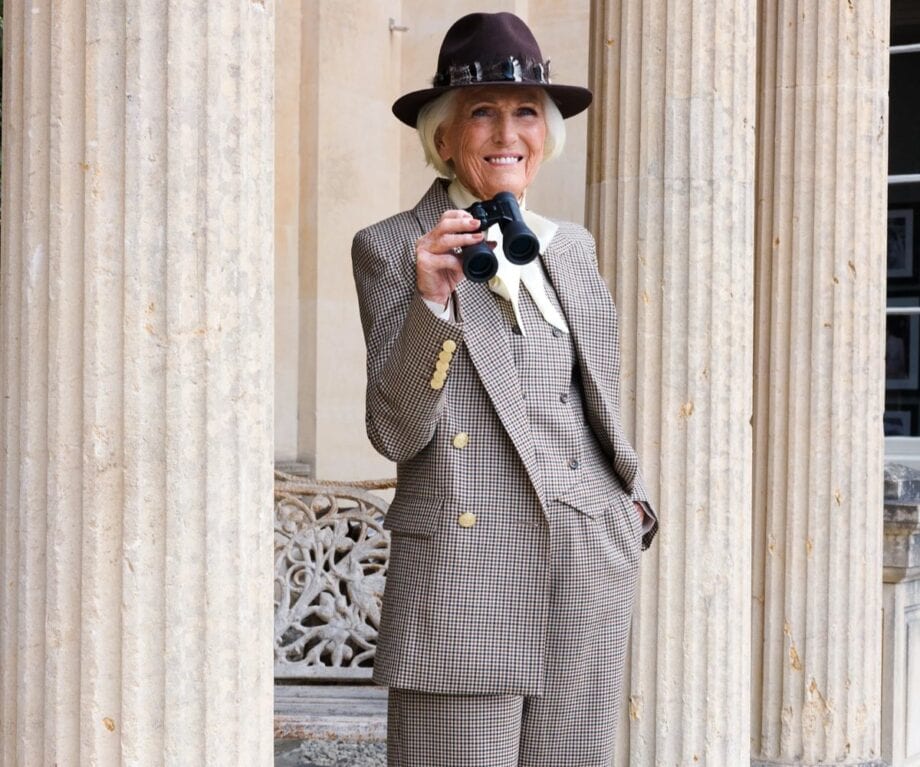 When Mary Berry steps into the frame for the campaign, she wears pieces such as the Westminster Tweed blazer in signature form—crisp lines, heritage wool, the kind of garment built to last beyond seasons. The cut is elegantly minimal and it is available in both chalk-stripe and pin-stripe variants. Her look pairs the blazer with fine wool trousers or a coordinating waistcoat.