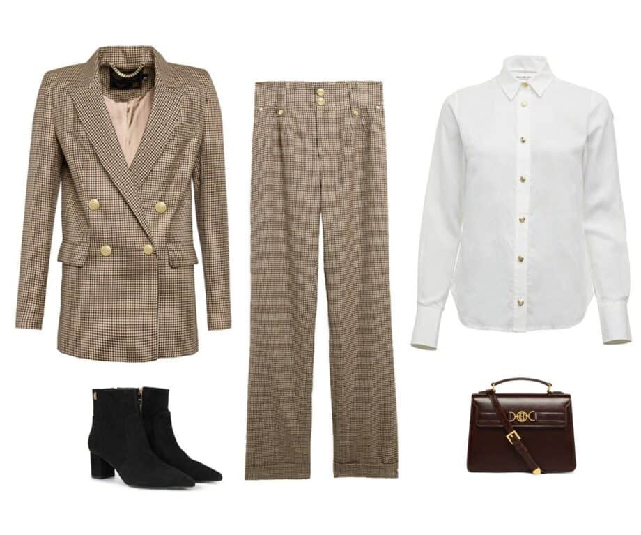 Here Jodie is styled in a Tawny Tweed suit or alternatively the Westminster Tweed look—strong shoulders, built structure, warm heritage hues. The suit comprises a fitted blazer with matching tailored trousers, the kind of ensemble that transitions from boardroom to country manor with equal ease. The material is rich tweed woven in the UK, while the silhouette retains a sleek and modern edge.