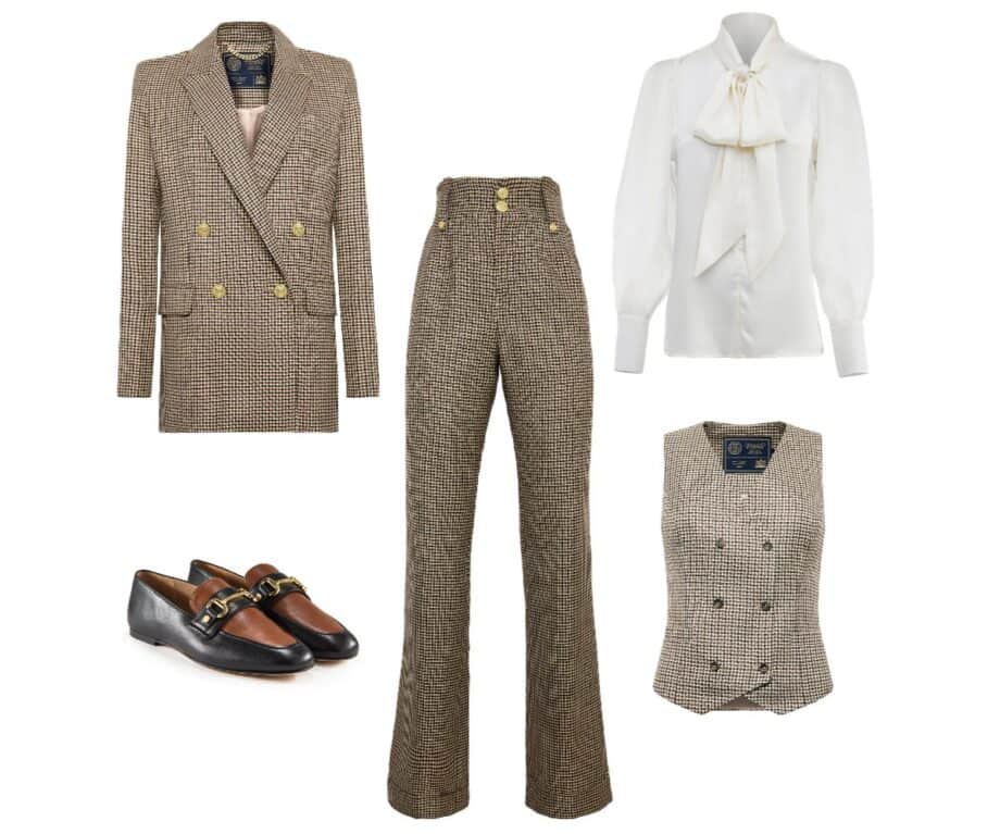 Jade appears in the Westminster Tweed look (and alternate chocolate houndstooth variants) which include the Belgravia blazer, Hampton waistcoat and high-waisted wide-leg trouser set. The fabrics are drawn from centuries-old Scottish mills, cut and sewn by artisan hands in Britain. The blazer’s structure is bold yet elegant—with defined shoulders, narrow waist and a finish that signals both confidence and refinement.
