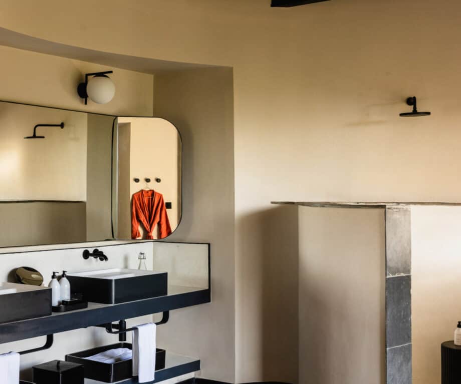 Continue further into the suite from the sleeping area and you’ll pass through the dressing into the bathroom which has double sinks, a double shower and again those insanely beautiful views over Kili. The style is minimalistic with mostly black and white tones, yet it still feels warm and welcoming. Africology toiletries and products emphasise the will to keep things natural and organic.