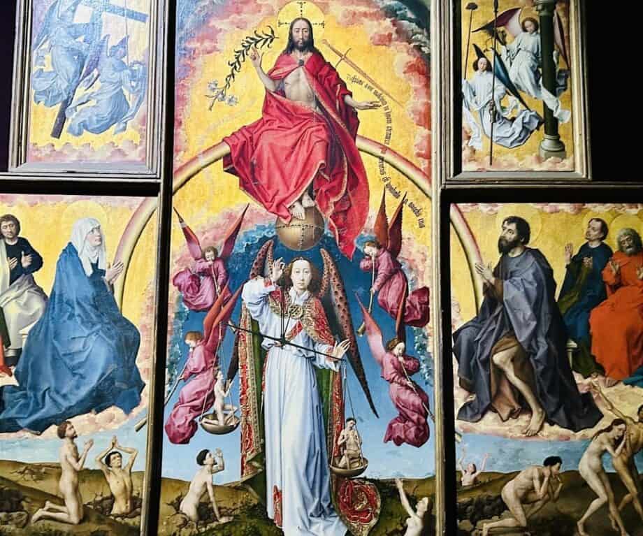 As we enter the astoundingly ornate Hôtel-Dieu Museum, we are told, “Maybe it was called the Hospital of God because God was your best hope of recovery.” Medicine was primitive and putting two patients in a bed only increased fatalities. Prayer and surrounding the patients with religious art aimed to prepare them for the next world. Worryingly for patients, at the bottom of Rogier van der Weyden’s The Last Judgement altarpiece they saw more people heading for Hell than Heaven.