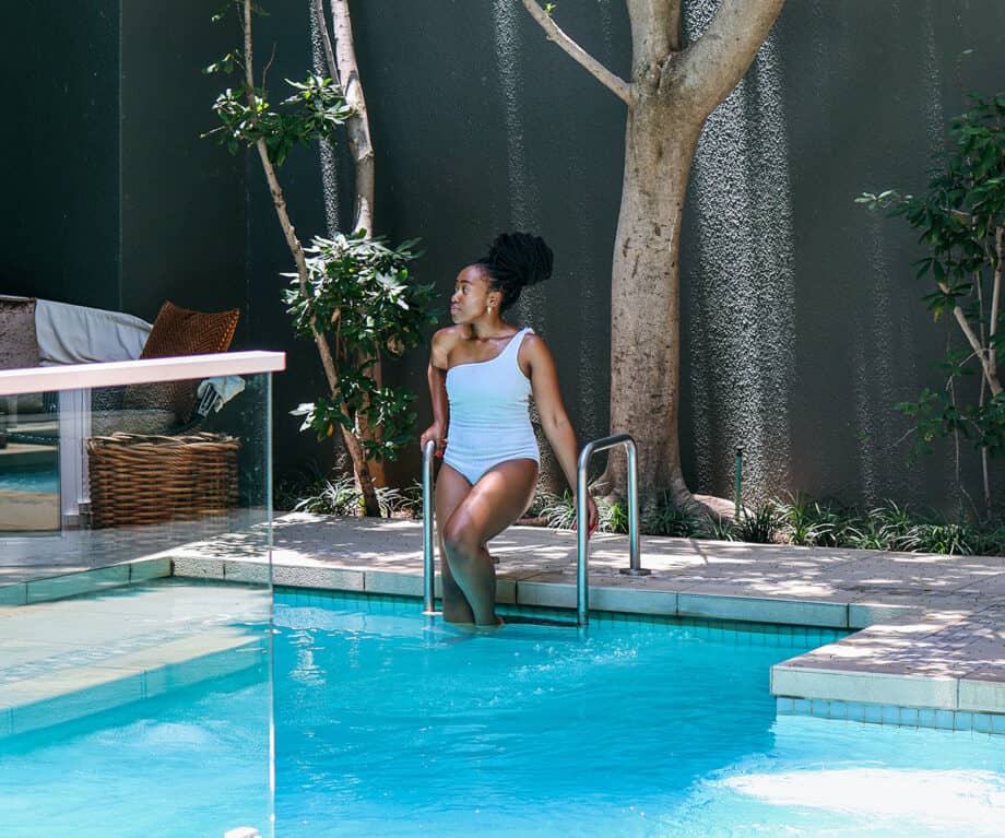 When it’s time to venture out of the sanctuary of the room, the corridors lead to a spread of communal areas. In the inner courtyard, a heated pool, a Koi pond, a gym, and cabanas provide a welcome space for downtime. Shifting through the building, the Olive Bar, Piano Lounge and Terrace offer casual, refined spaces for connection over one of the Saxon classic dishes or a glass of celebrated South African wine. All of these lead to the large outdoor heated pool, which serves as an azure frontispiece to the hotel.